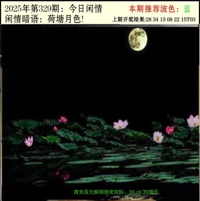 329期闲情暗语:【荷塘月色】 解释:图片显示,荷花和月亮,解出水肖鼠猪,月亮解出天肖牛猪兔龙马猴 送六肖:牛猪兔龙马猴 开:牛17准